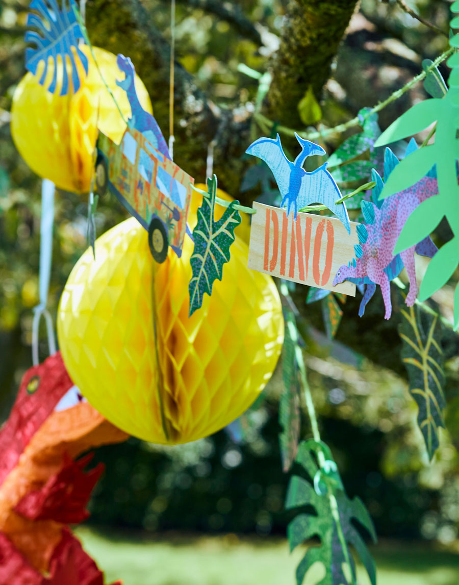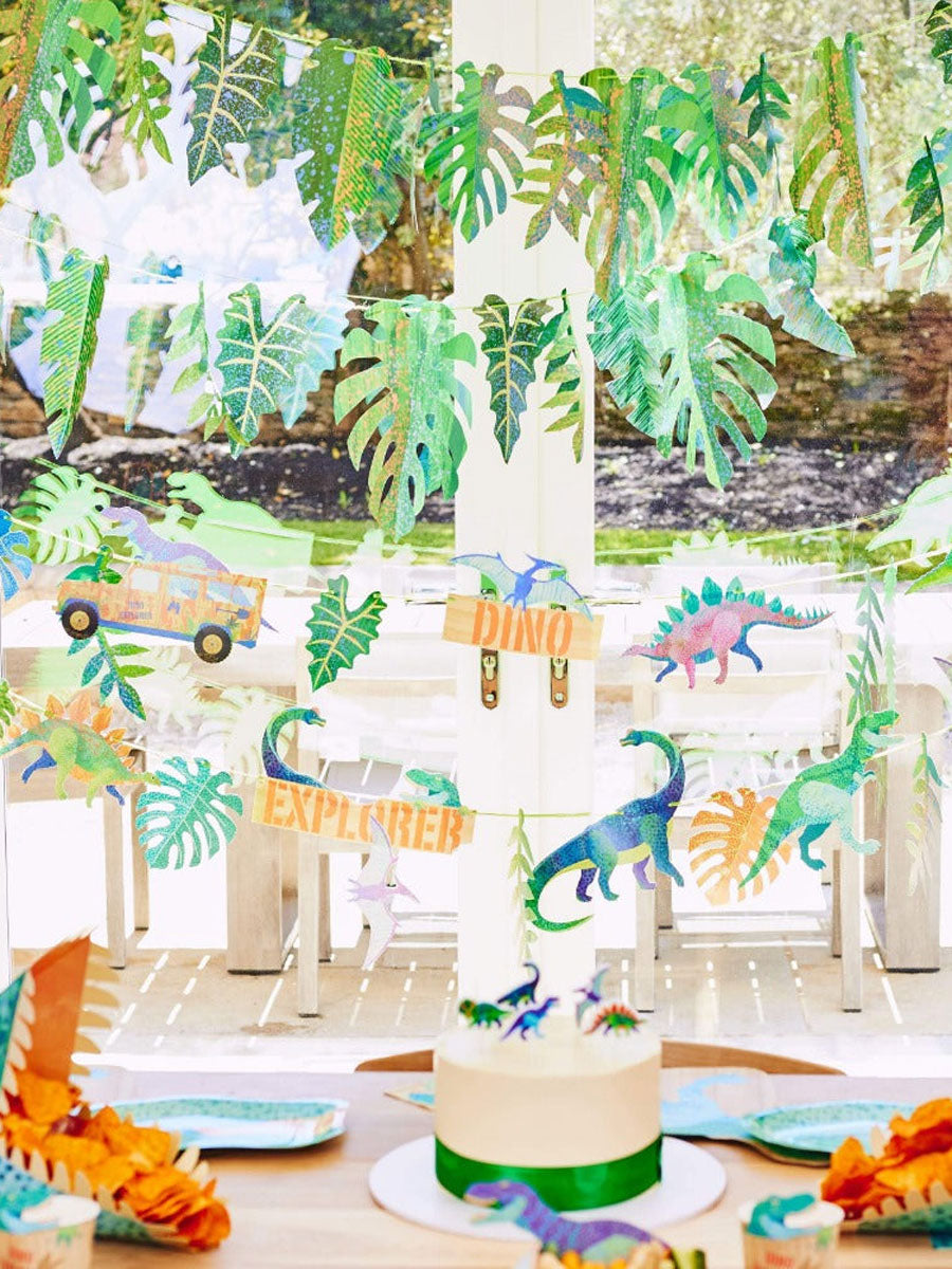 Complete with brightly coloured jungle leaves, a dino explorer sign, trucks, and dinosaurs, this 3m garland will transform any plain background ready for your dino-themed celebration. It’s ideal for decorating kids’ parties and can also be re-used as a permanent addition for your little ones bedroom afterwards. This card garland has been designed exclusively by Party Pieces and arrives with 2 x 1.5m parts that are pre-strung and ready to hang for instant decoration.